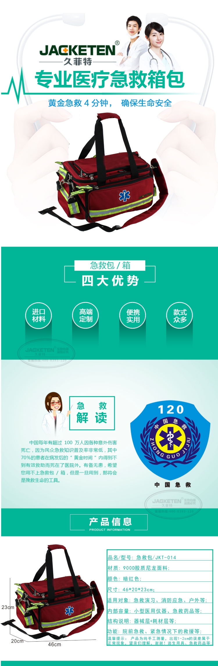 品名/貨號:急救包/JKT-014;材質:900D股質尼龍面料;顏色:暗紅色;尺寸:46*20*23cm;適用對象:急救演習、消防應急、戶外等;內部容量:小型醫用儀器、急救藥品等;結構說明:器械層+耗材層;功能:院前急救、緊急情況下的救援等