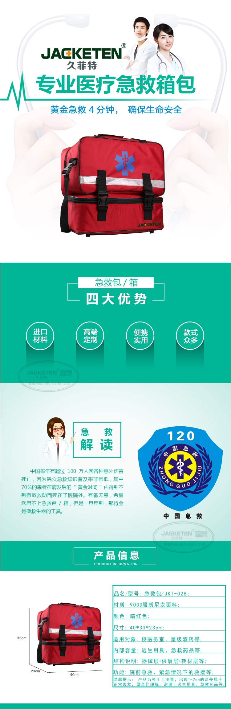 品名/貨號:急救包/JKT-028;材質:900D股質尼龍面料;顏色:暗紅色;尺寸:40*33*23cm;適用對象:校醫務室、星級酒店等;內部容量:逃生用具、急救藥品等;結構說明:器械層+耗材層;功能:院前急救、緊急情況下的救援等